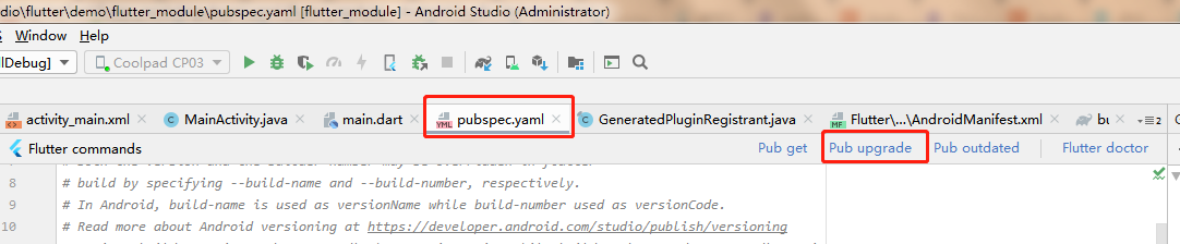 ?在?pubspec.yaml 文件页面,点击? ?Pub upgrade ,然后AS会自动更新改库