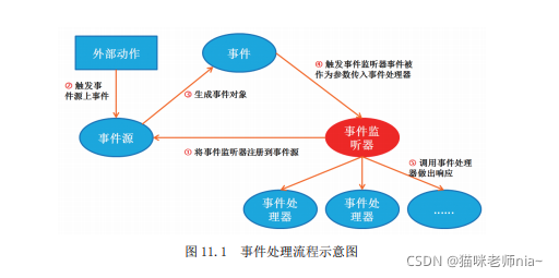 - Event Listener(事件监听器):监听事件源所发生的事件,并对不同的事件做出相应的响应。