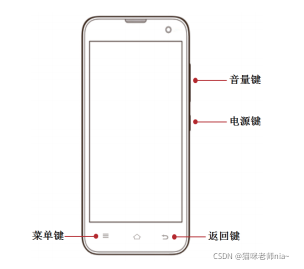 ????????对于一个标准的 Android 设备,包含了多个能够触发事件的物理按键。例如,手机上的常用物理按键,如图所示。