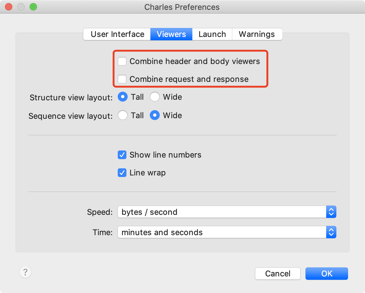 2、Charles首次安装启动后默认不显示response和request模块,选择Charles -> Perferences -> Viewers 取消勾选“combine request and response”配置,点击ok保存后便在主页显示response和request模块;  3、配置Http代理,点击Proxy -> Proxy Settings;  Port 端口选择8888上进行监听,勾选 SOCKS proxy 使工具能够截取到浏览器的 http 访问请求;  4、安装PC端根证书,点击Help -> SSL Proxying -> Install Charies Root Certificate;  为Charles Proxy CA设置信任设置SSL始终信任;