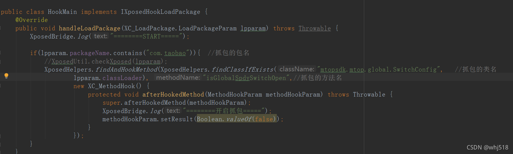 if(lpparam.packageName.contains("com.taobao")){ //抓包的包名