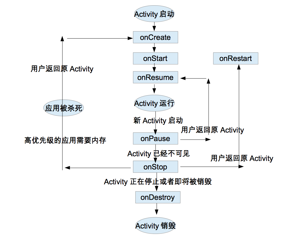 - ?当用户再次回到原来的Activity,回调如下:onRestart ——> onStart ——> onResume