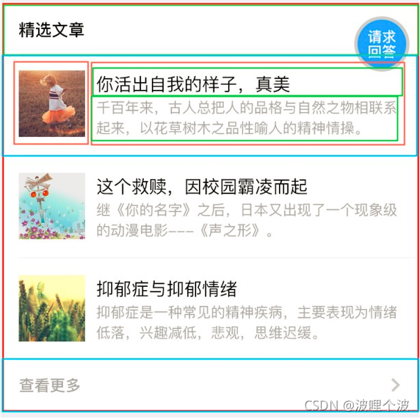 ????????3、定义三个view,用来承载三个精选文章列表,这三个view,效果都是一样的,区别点在于图片和文字不同;给这三个view添加class:articleView ?? ? ????????4、在articleView里面分了左右两部分 ?? ??? ?????????4.1 在articleView定义两个子view;左边承载图片,右边承载文字;给右侧的view添加class:articleContent; ?? ??? ?????????4.2 在articleContent分为上下两部分,定义两个子view,分别添加class:articleTitle、articleDesc;