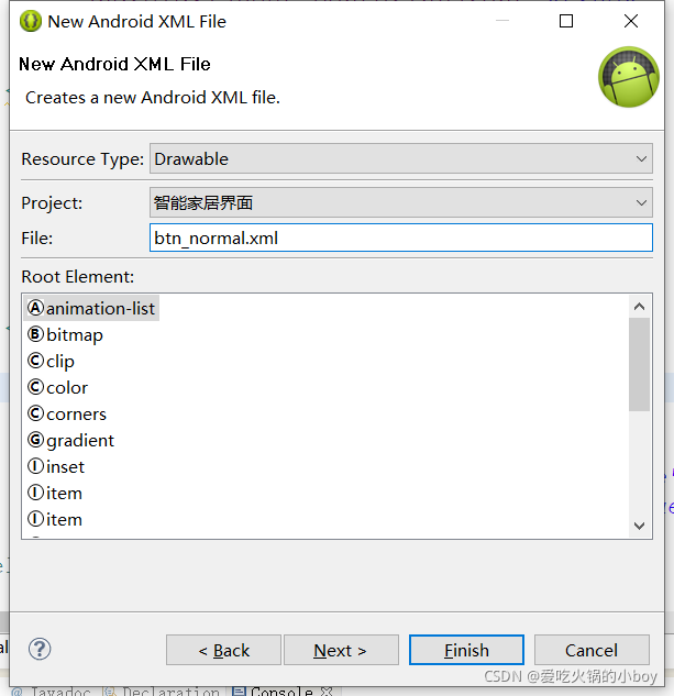(1)在项目文件下创建xml文件,在res文件夹下,右键点击drawable-mdpi,先择New,点击other。在Android文件夹下,双击Android XML File,起名一个以.xml结尾的名字