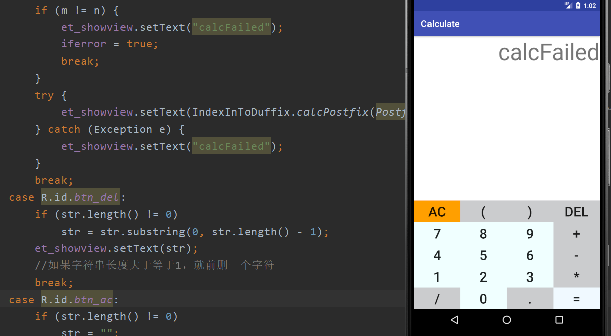 - 圆括号的匹配,分别对左右括号进行计数,左右括号的数量必须一致否则会显“calcFailed”