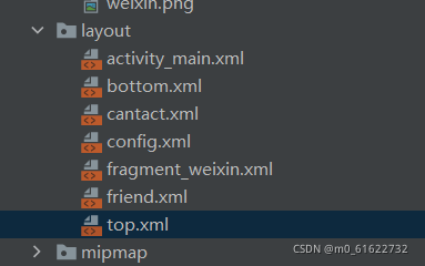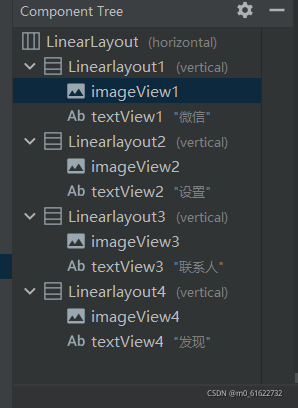 1.编写 bottom.xml 该文件需要用五个 LinearLayout,分为一个LinearLayout 和四个子 LinearLayout ,每个里面子 LinearLayout 中创建一个?ImageView 和一个 TextView ,添加id,调整layout_width、layout_height、背景颜色与字体颜色,添加需要的图片,修改显示内容。