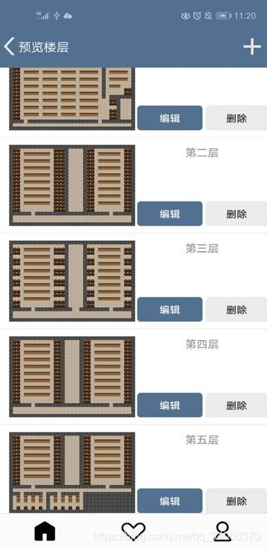 4.输入完账号密码点击登录会跳转到程序的“主页面”,此页面分为上中下3部分,上:是标题、返回、功能按钮,中:是显示各个楼层的预览图,下是3个模块切换,第一个选中的模块是楼层模块,第二个是楼层模板模块,第三个是用户模块
