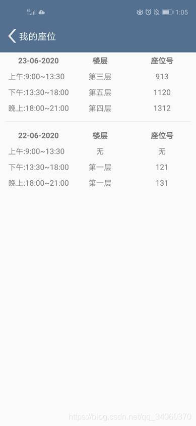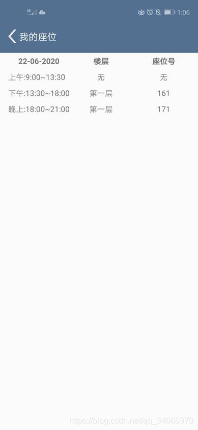 9.选完座位,可以在“个人信息”界面的我的座位按钮点击进入“我的座位”信息界面,显示自己的座位信息 ?