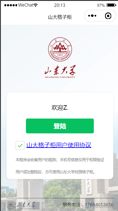 <view style="font-size: 24rpx; color: gray;">用户成功登陆后,方可使用山东大学校园格子柜。</view>