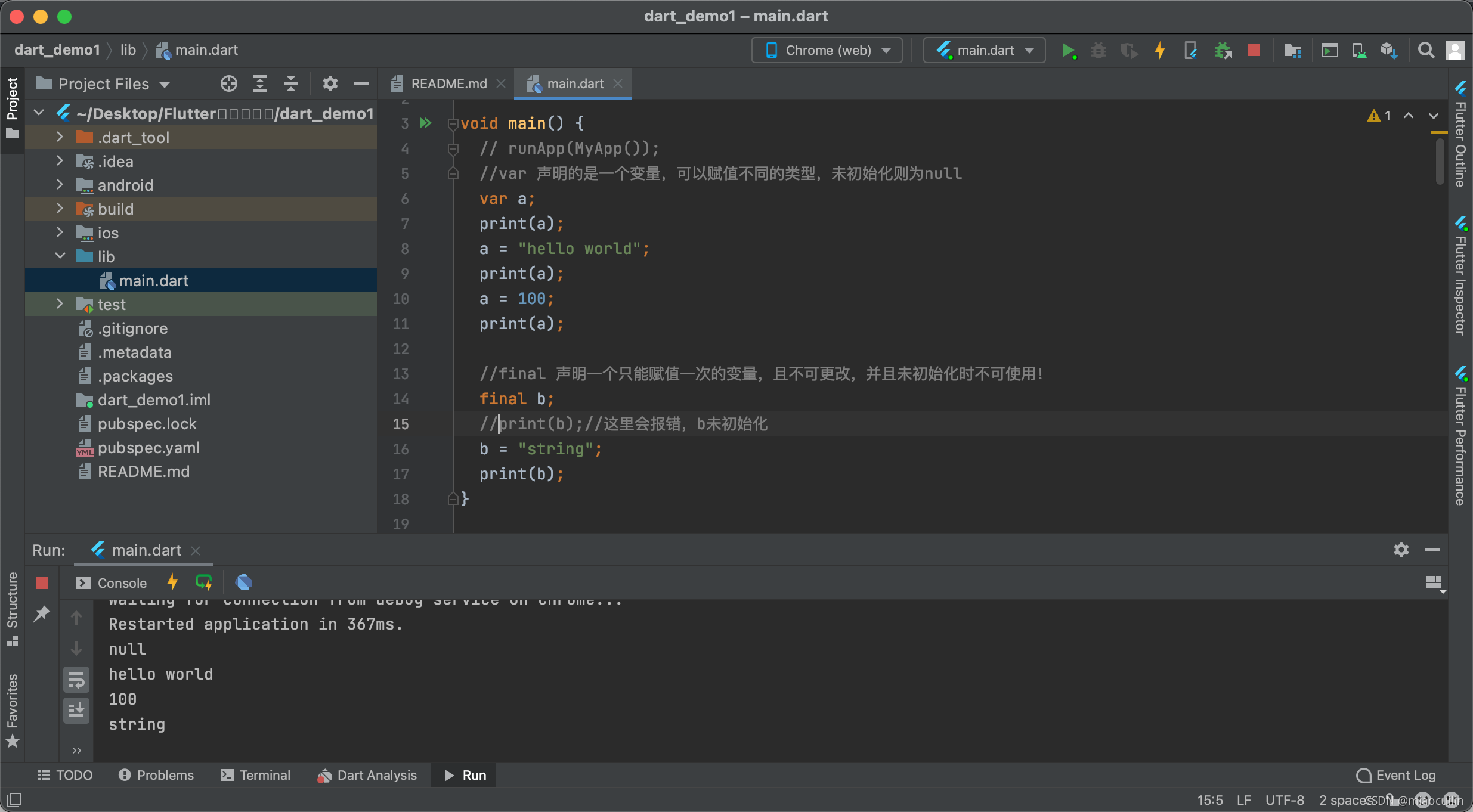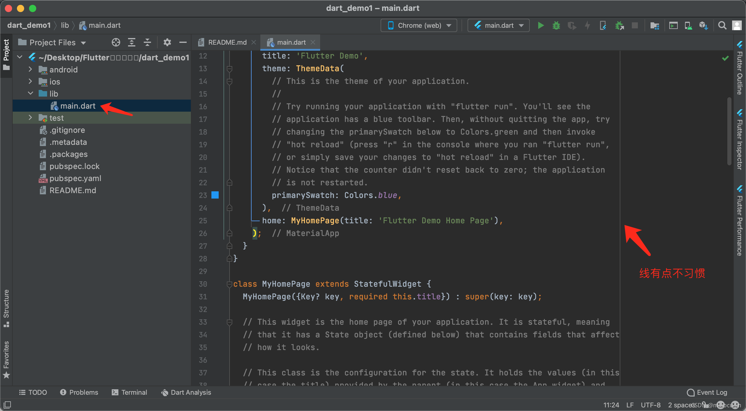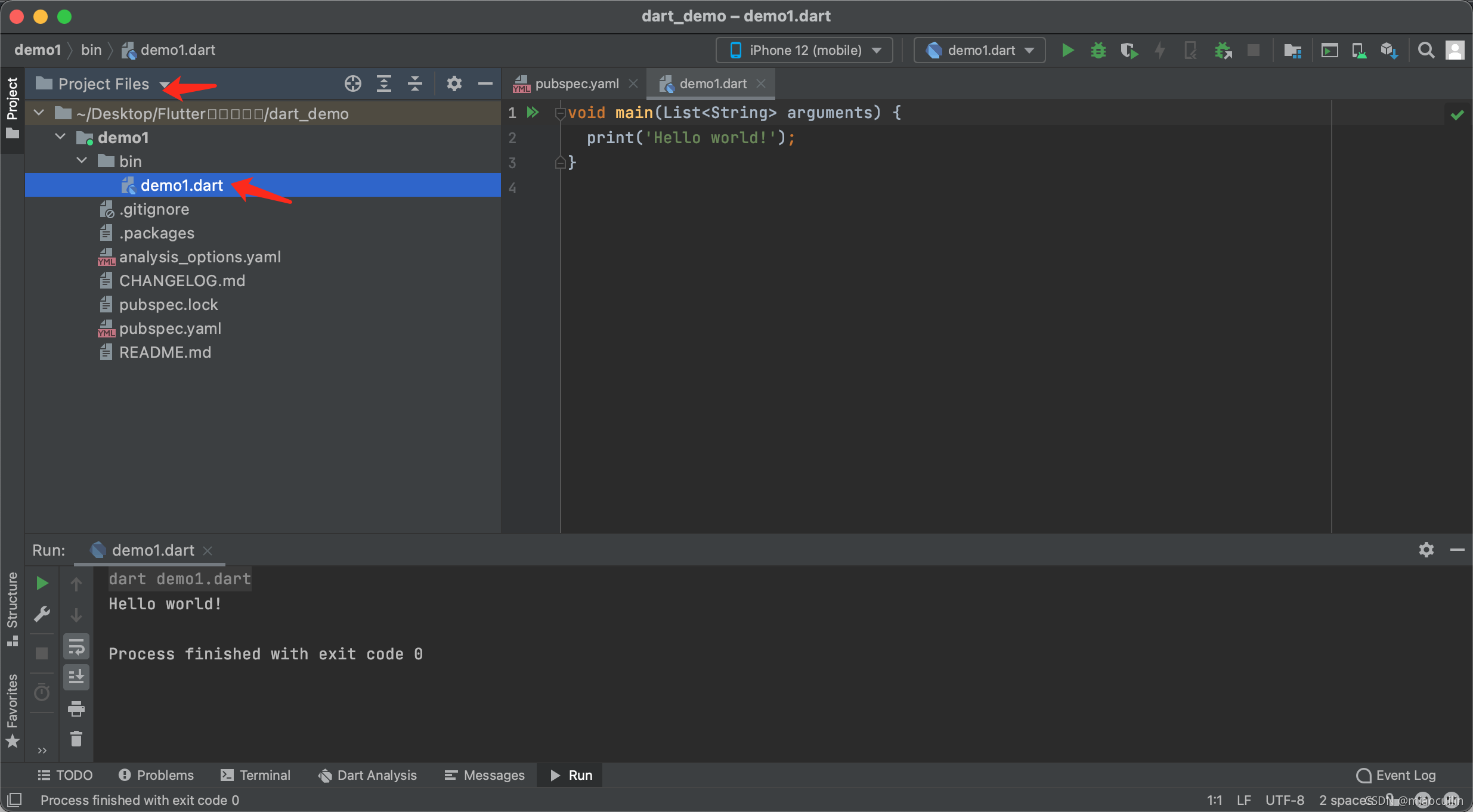 打开demo1.dart就可以看到类似OC工程里main文件的文件了。