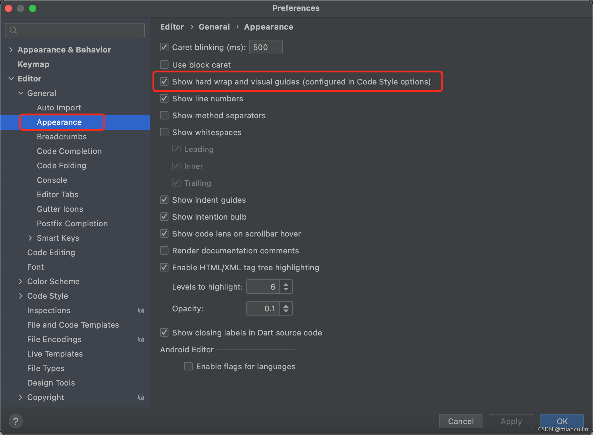 注意右侧这个竖线,是控制代码行数和分割右侧展示区的线,不习惯的话可以去下图位置去掉勾选。