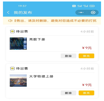 7.1 我的发布 该页面用于展示用户自己发布的物品,可以对物品进行“删除”操作和“擦亮”操作,“删除”后该物品将从数据库中移除,“擦亮”操作可以使物品的展示时长默认增加7天。 点击物品可以进入相应的物品详情页面。