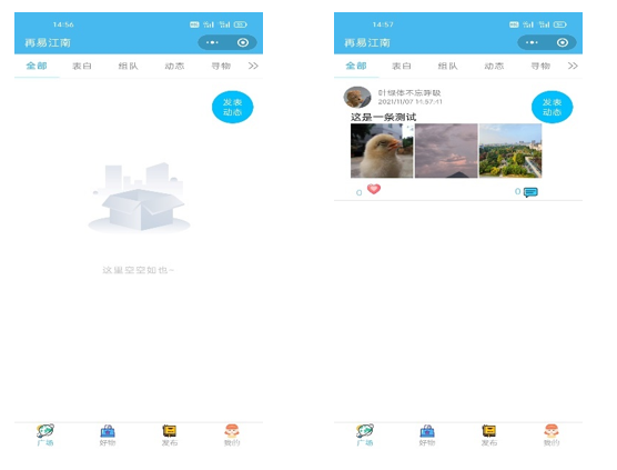 该页面包括校园的表白、组队招募、动态分享、寻物启事及失物招领。页面顶部可以选择类别而选择展示的内容,包括“全部”、“表白”、“组队”、“动态”和“寻物”。师生可以在这里进行交流,点击动态即可进入相应的详情页。每条动态均可以通过点击动态下的“点赞”图标对该条动态点赞,留言图标处可以显示该条动态下的留言数量。 点击悬浮的“发表动态”则会跳转动态发表页面。