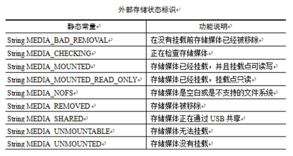 当程序通过Context类的openFilelnput()、OpenFileOutput()来打开文件输入流、输出流时,程序所打开的都是应用程序的数据文件夹里的文件。 因为Android设备的内部存储空间有限,所以能够存储的文件大小也就很有限,而诸如SD卡的外部存储设备可大大地扩充Android设备的存储能力。Android应用开发中常使用Environment类获取外部存储器目录。 在访问外部存储器之前一定要先判断外部存储器是否已经是可使用状态(即已挂载或可使用),并且需要在AndroidManifest.xml配置文件中添加外部存储读和写的权限。