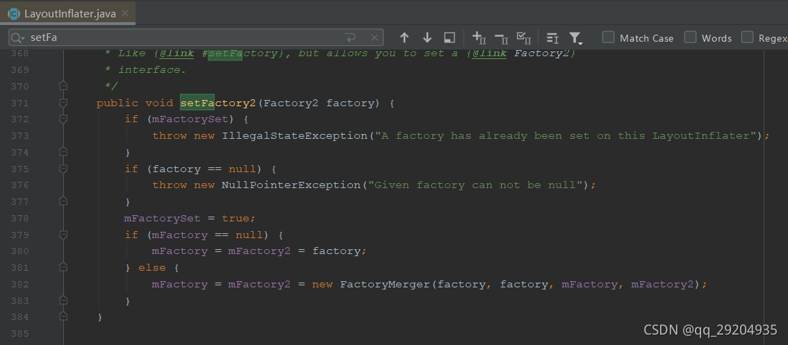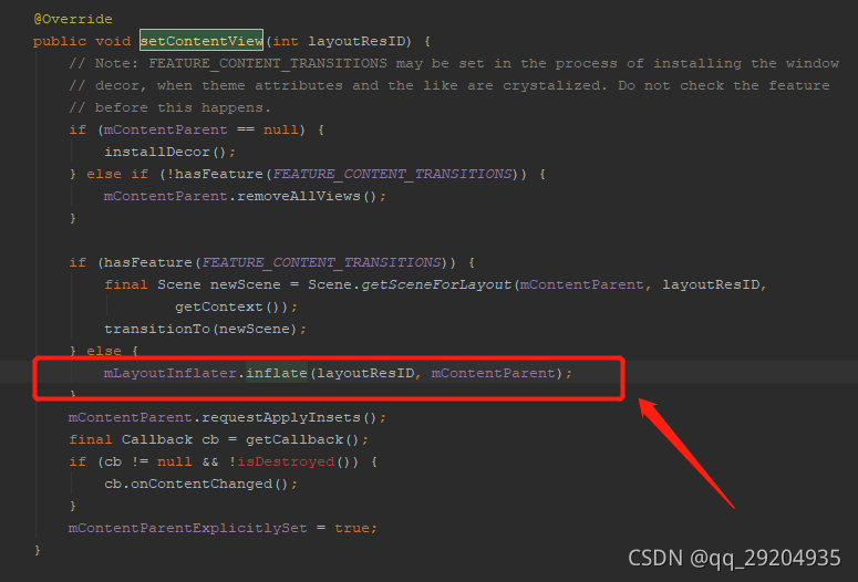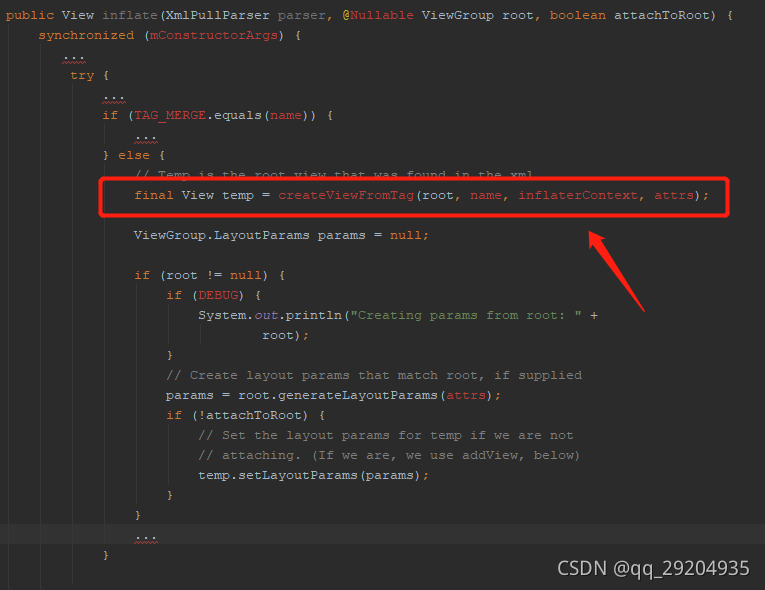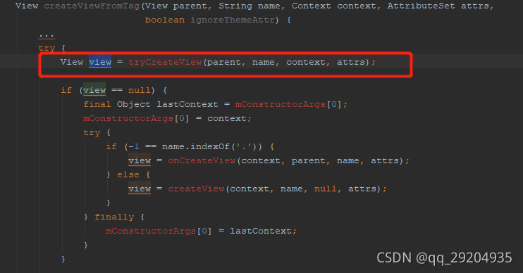 首先我们要先了解android View是怎么从xml解析成View的,这里分析的是Activity。 以setContentView方法作为入口:可以看出调用了getWindow().setContentView(layoutResID),而这个getWindow()就是PhoneWindow  在这里主要是调用了LayoutInflater的inflate方法   这里代码太多了,删减了一部无关代码,可以看出通过createViewFromTag(root, name, inflaterContext, attrs)我们就得到想要的View实例  尝试去创建View  关键点来了,我们发现这里有个mFactory2的东西,他其实就是一个接口,继承自Factory,只有一个未实现的onCreateView方法,可以实现了这个接口,然后干预的View创建流程  那么我们怎么去实现,自定义这个Factory2方法呢?原来Layoutmanager开放了这个使用,那就好办了  那么我们实现一下这个方法看看:  打印出来的就是当前Activity的所有的View的名称,而第四个参数attrs就是我们在Xml里面设置的属性 到此又产生了疑问,我怎么确定哪个View要换肤呢?