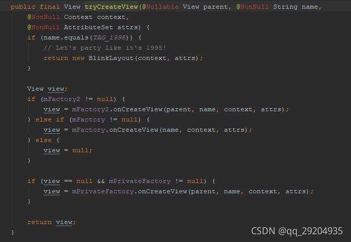public View onCreateView(@Nullable View parent, @NonNull String name, @NonNull Context context, @NonNull AttributeSet attrs) {