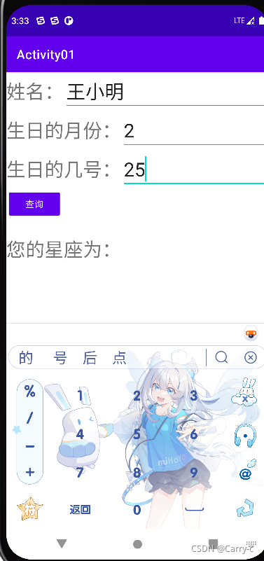 第一步:在主界面写两个startactivity,一个用于接收第二个页面传递过来的数据;另一个用于发送用户输入的数值