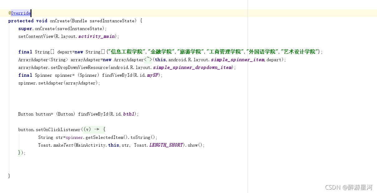 final String[] depart=new String[]{"信息工程学院","金融学院","旅游学院","工商管理学院","外国语学院","艺术设计学院"};