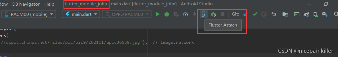 - 点击 AndroidStudio 的 Flutter Attch 按钮(前提是 安装过flutter 与 dart 插件)