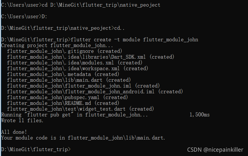 D:\MineGit\flutter_trip>flutter create -t module flutter_module_john
