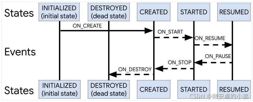 Lifecycle使用状态和事件两种枚举来跟踪其关联组件的生命周期状态。