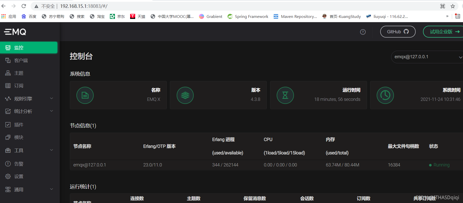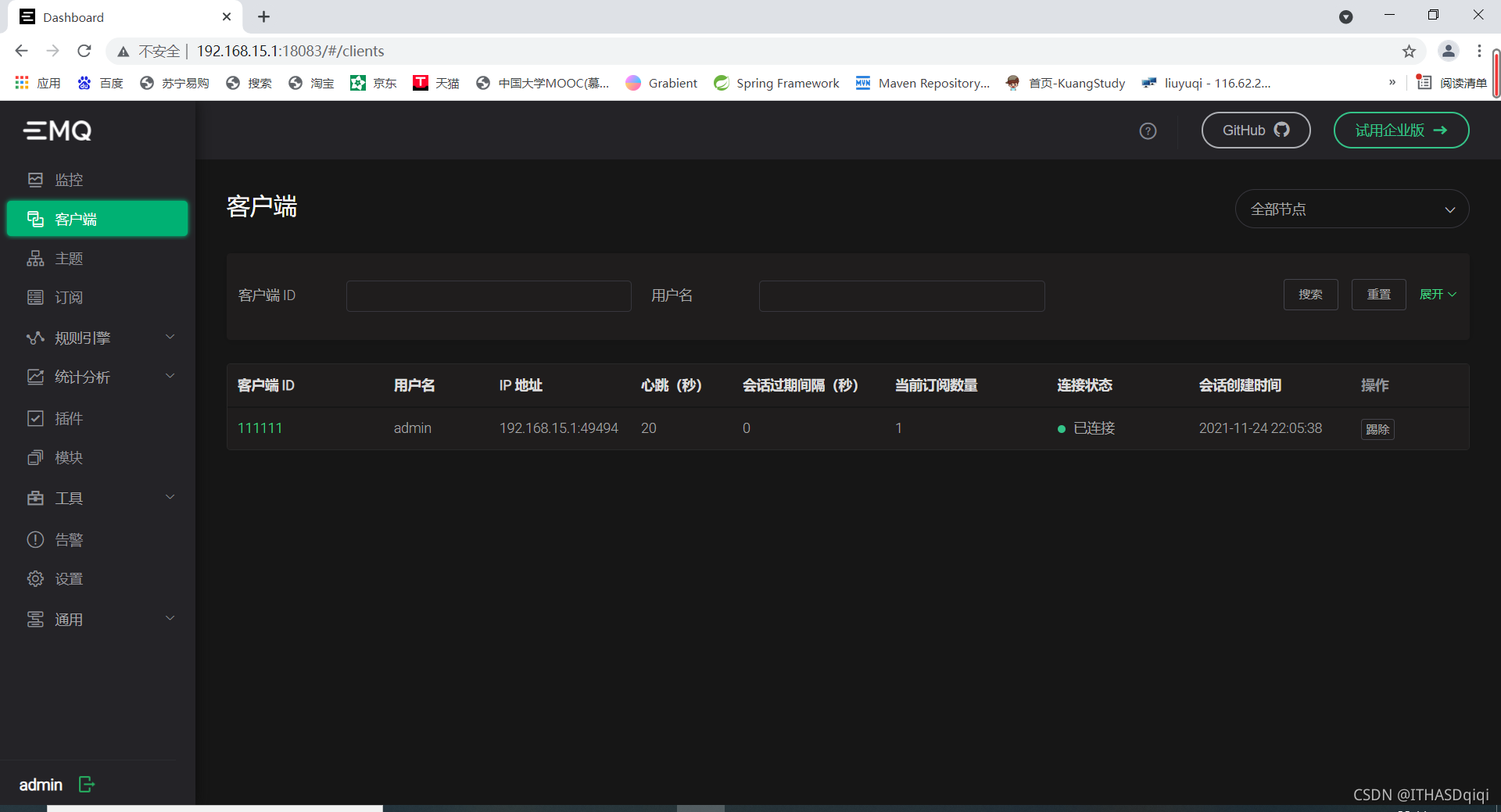 ?运行启动,此时打开网页的192.168.15.1:18083可以发现有一个客户端连接成功!