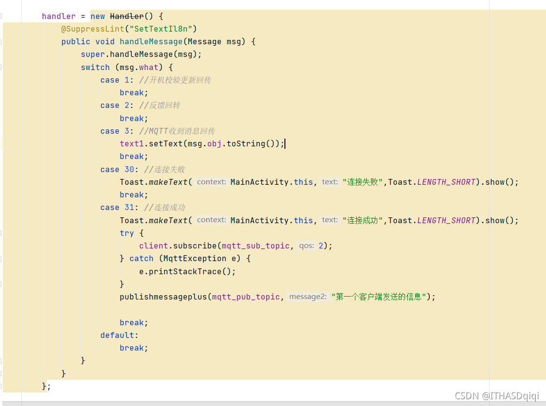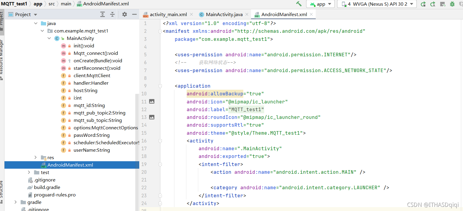 首先在MainActivity的java文件中确定编写mqtt的客户端代码如下: