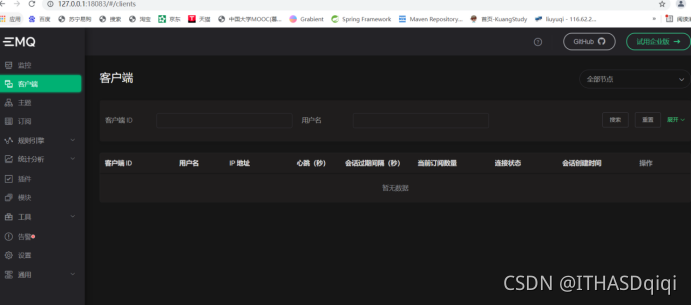 此时登录成功,可以在设置中开启中文,此时也可以点击客户端,查看此时连接emqx服务器的客户端。(此时并没有客户端连接
