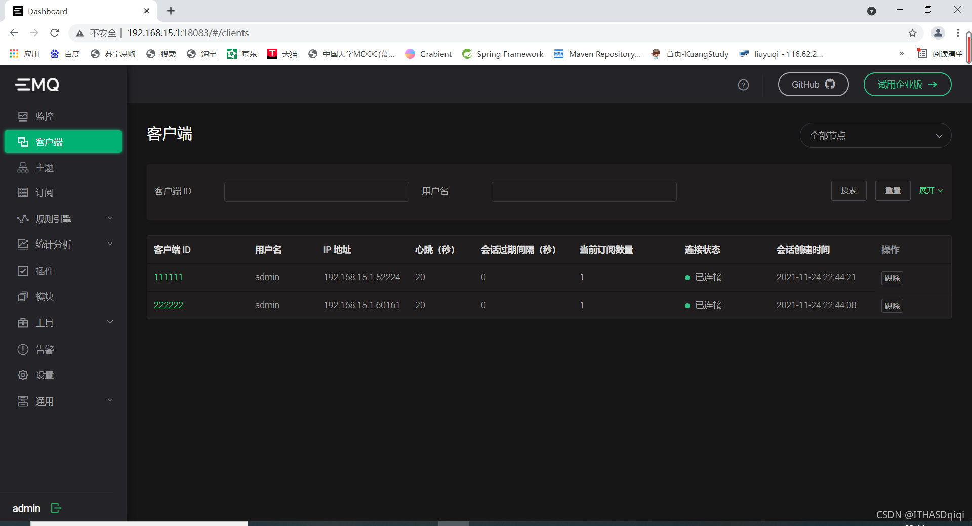 ?我们也可以使用http://192.168.15.1:18083 进入登录页面,账号密码相同,其实本质上来使用192.168.15.1还是127.0.0.1用谁打开服务器都没影响,因为他们都是属于你本机ip地址,但是在后面的客户端连接服务器时,需要使用192.168.15.1这个ip,不然的话可能到时候会连接不上。