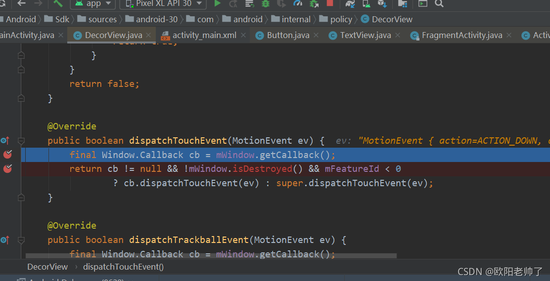 我们看到它先执行了DetorView的dispatchEvent