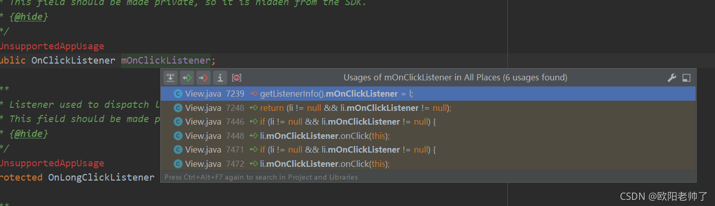先整个点击事件监听,然后ctrl点那个setOnClickListener方法进去看,然后我们会看到