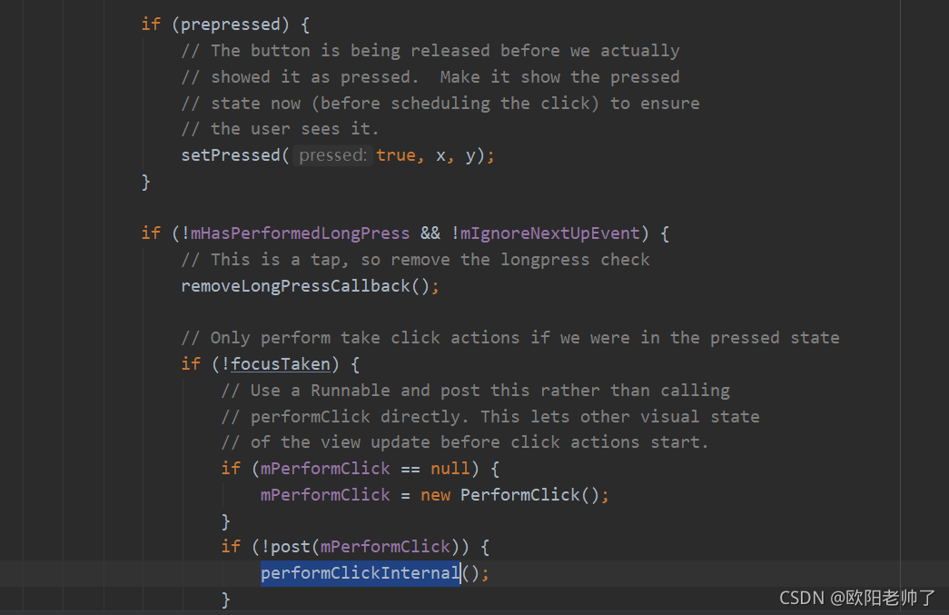 ?最终指向的是View的onTouchEvent的ACTION_UP的时候调用的,其中实现是用PerformClick异步执行,若不成功再调用performClick(),performClick()则执行OnClickListener中的onClick方法