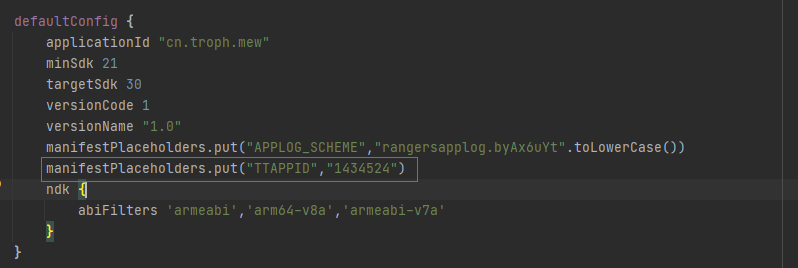 在Android Gradle manifestPlaceholders自定义变量取值:  如图,在Gradle里面配置了一个TTAPPID占位符,那么在AndroidManifest里面就可以这样写了: