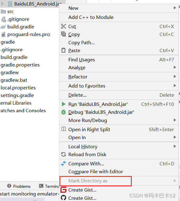 在libs目录下,选中jar文件(BaiduLbs_Android.jar)右键,选择Add As Library…(因为已经添加过,所以这里无法点击)