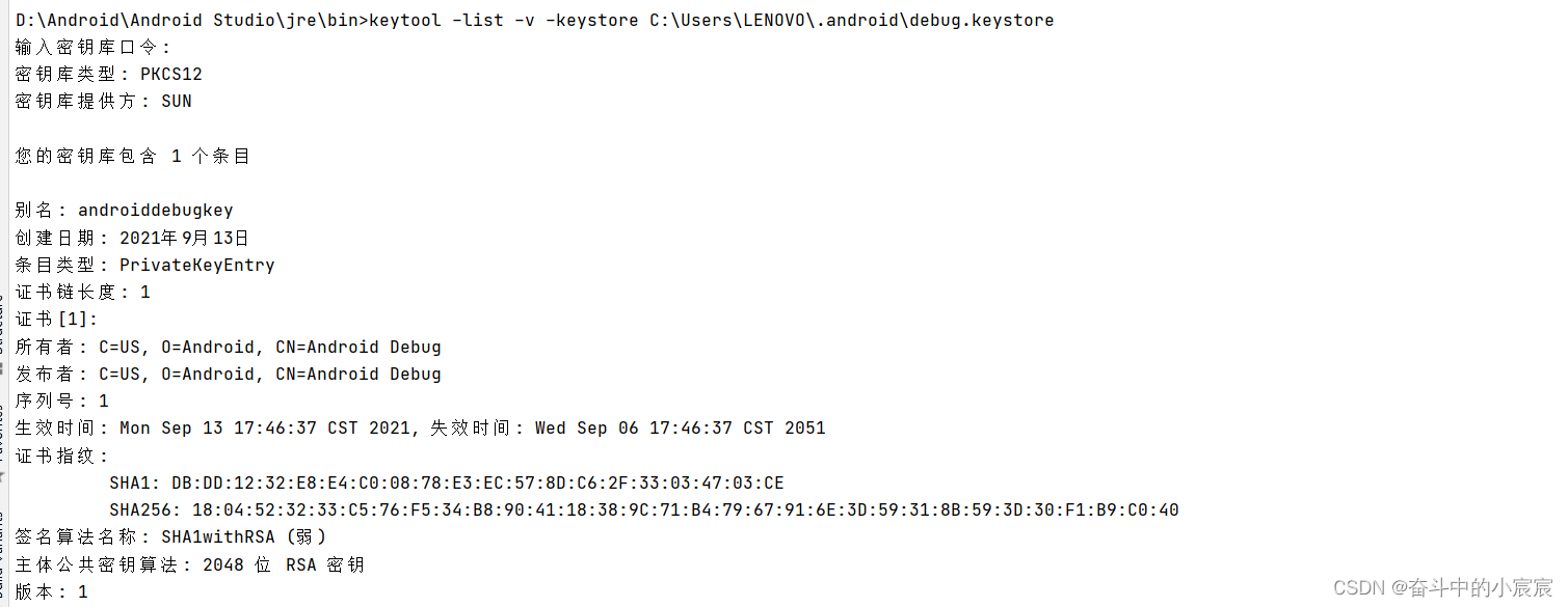 (????????命令行:keytool -list -v -keystore +debug.keystore的路径;