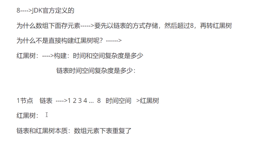 3、什么情况下转为红黑树,代码体现? ==================  代码体现: static final int TREEIFY_THRESHOLD = 8; final V putVal(int hash, K key, V value, boolean onlyIfAbsent, boolean evict) { … if ((e = p.next) == null) { p.next = newNode(hash, key, value, null); if (binCount >= TREEIFY_THRESHOLD - 1) // -1 for 1st treeifyBin(tab, hash); break; } … } 4、红黑树有什么特性?红黑树的时间复杂度是多少?理想中的HashMap的时间复杂度是多少? ============================================= 4.1、红黑树有什么特性?