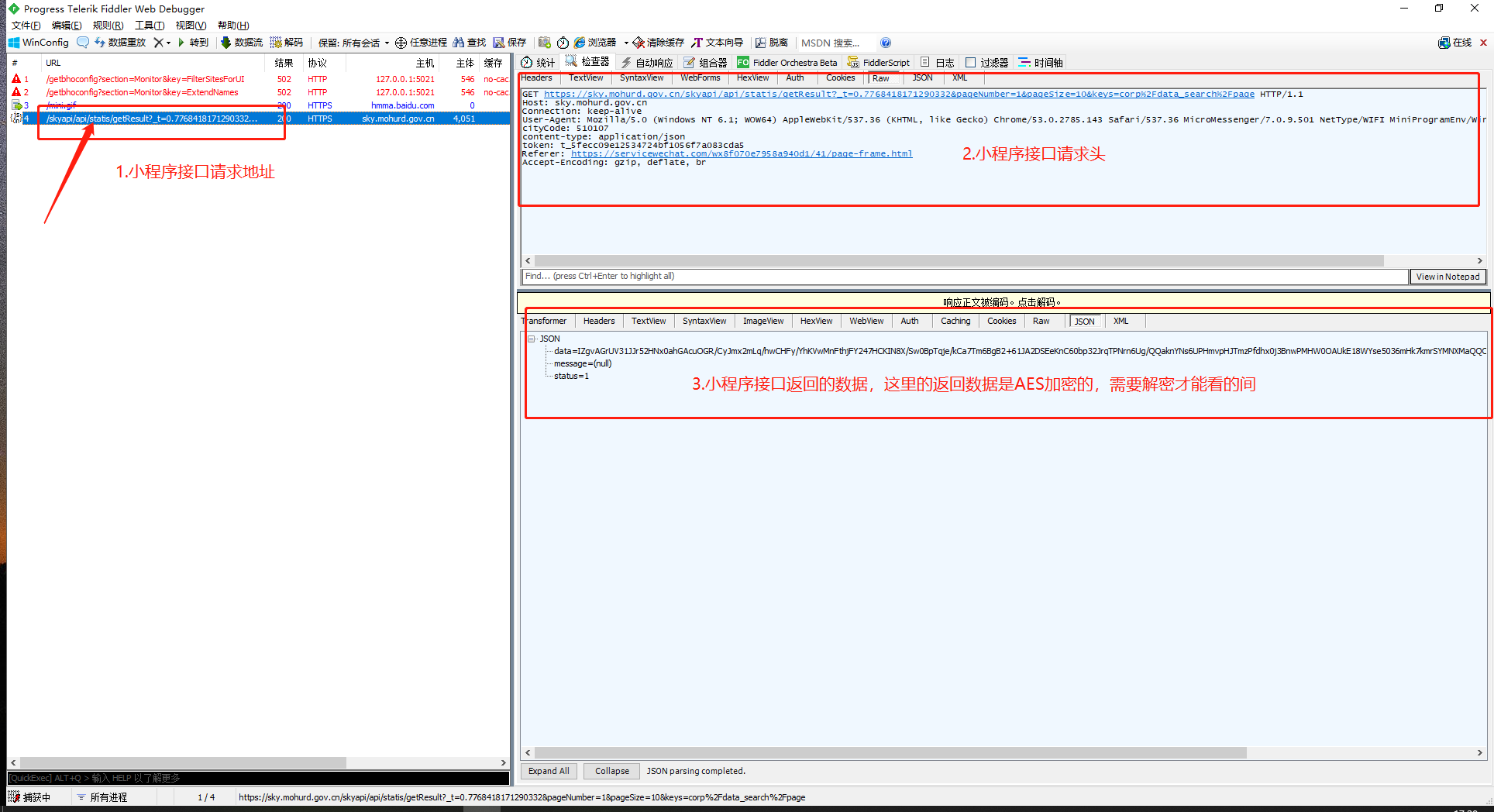 我比较喜欢使用Fiddler抓包工具,怎么安装和使用我在这里就不介绍了,自己去网上百度。通过Fiddler抓取到小程序的访问链接。