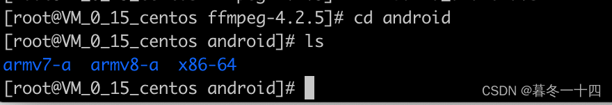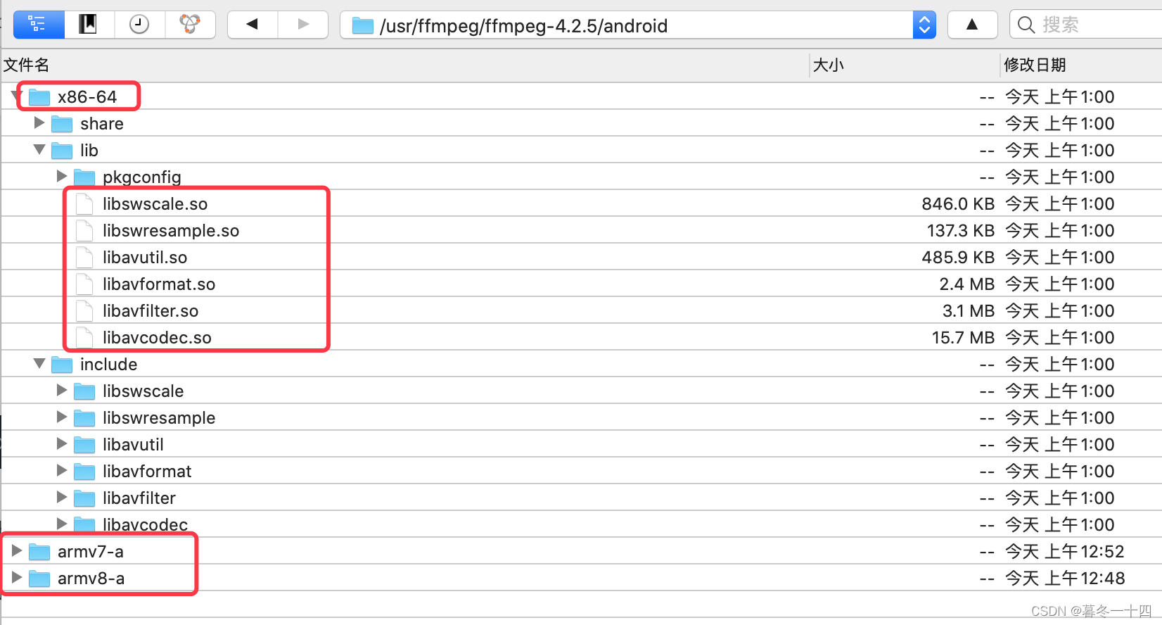 编译完成后会在ffmpeg-4.2.5下生成android文件夹,里面有三个平台的so库。