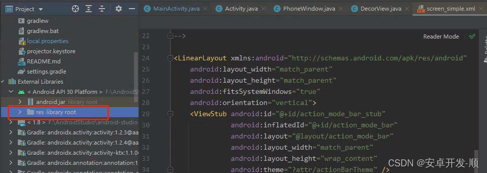 这些布局文件在android.jar --- res ---layout里面,在AS中和android.jar并列的res文件夹下就可以看到布局源码,我们随便看一个screen_simple.xml
