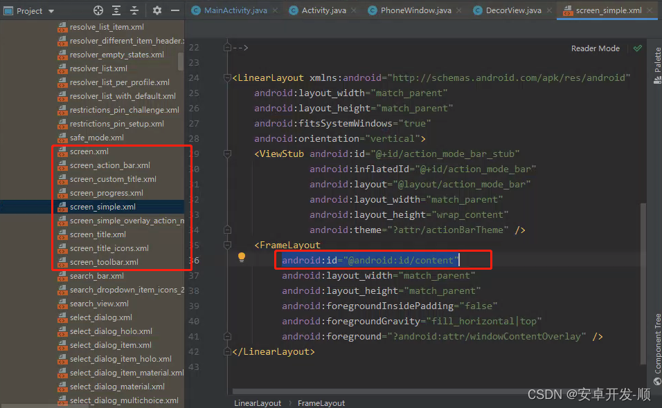 ?这些screen_开头的布局都是DecorView对应的布局,系统会根据各种样式、相关设置来选择对应的布局,每一个布局里面都会有一个FrameLayout,其id是@android:id/cotent,