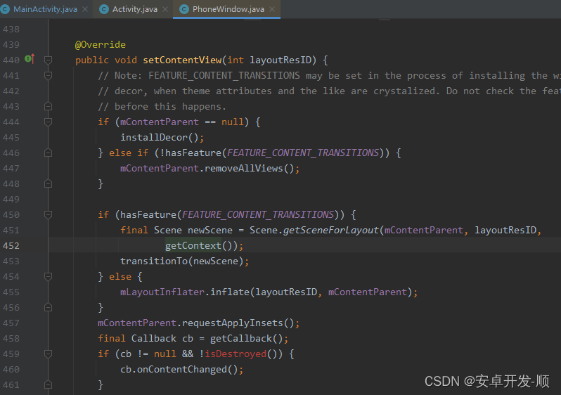 444行 的mContentParent就是用来承载我们写的布局的view,mContentParent的父布局则是DecorView,这里先上一张图把层次结构先明确一下