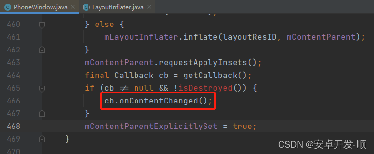 布局加载完后会通过getCallback得到一个cb,然后回调其onContentChanged()方法,这个callback就是我们写的Activity