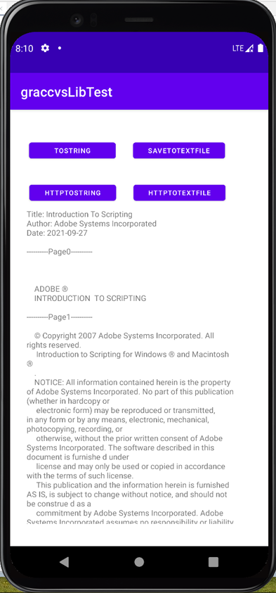 1:创建工程。 2:app\libs文件夹导入graccvs.aar。 3:Android工程的app的build.gradle文件dependencies单元中增加如下代码 ???implementation files('libs/graccvs.aar') 4:调用初始化函数Load设置动态链接库需要的临时文件夹。 5:调用Auth注册,免费版本设置为空。 6:调用文件函数ToTextFile、HttpToString等提取N个不同文件的正文,或者使用异步函数批量处理文件。 7:完成文件提取任务后调用 Unload函数,释放资源组件使用的资源。