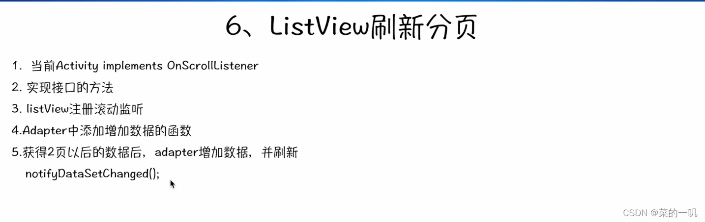 AbsListView.OnScrollListener接口的方法得到监听下拉滚动条的方法,同时判断是否最后一条信息已经显示,是的话就启动我们加载新数据的线程,加载完数据之后需要主页面进行刷新,因为子线程无法对主线程进行操作,这里我们使用了handler来向主线程发送请求,在主线程的handler里面判断,然后用notifyDataSetChanged();来进行操作,notifyDataSetChanged()可以在修改适配器绑定的数组后,