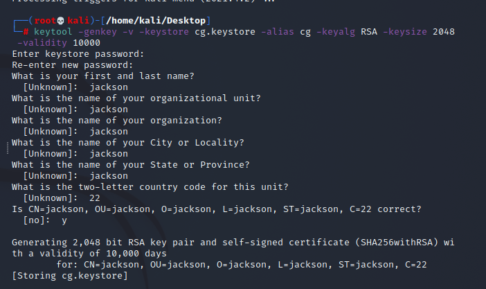 └─# keytool -genkey -v -keystore cg.keystore -alias cg -keyalg RSA -keysize 2048 -validity 10000