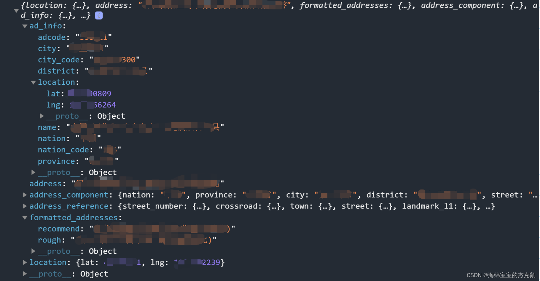 7、通过局部变量.reverseGeocoder将经纬度转化为对应的信息。