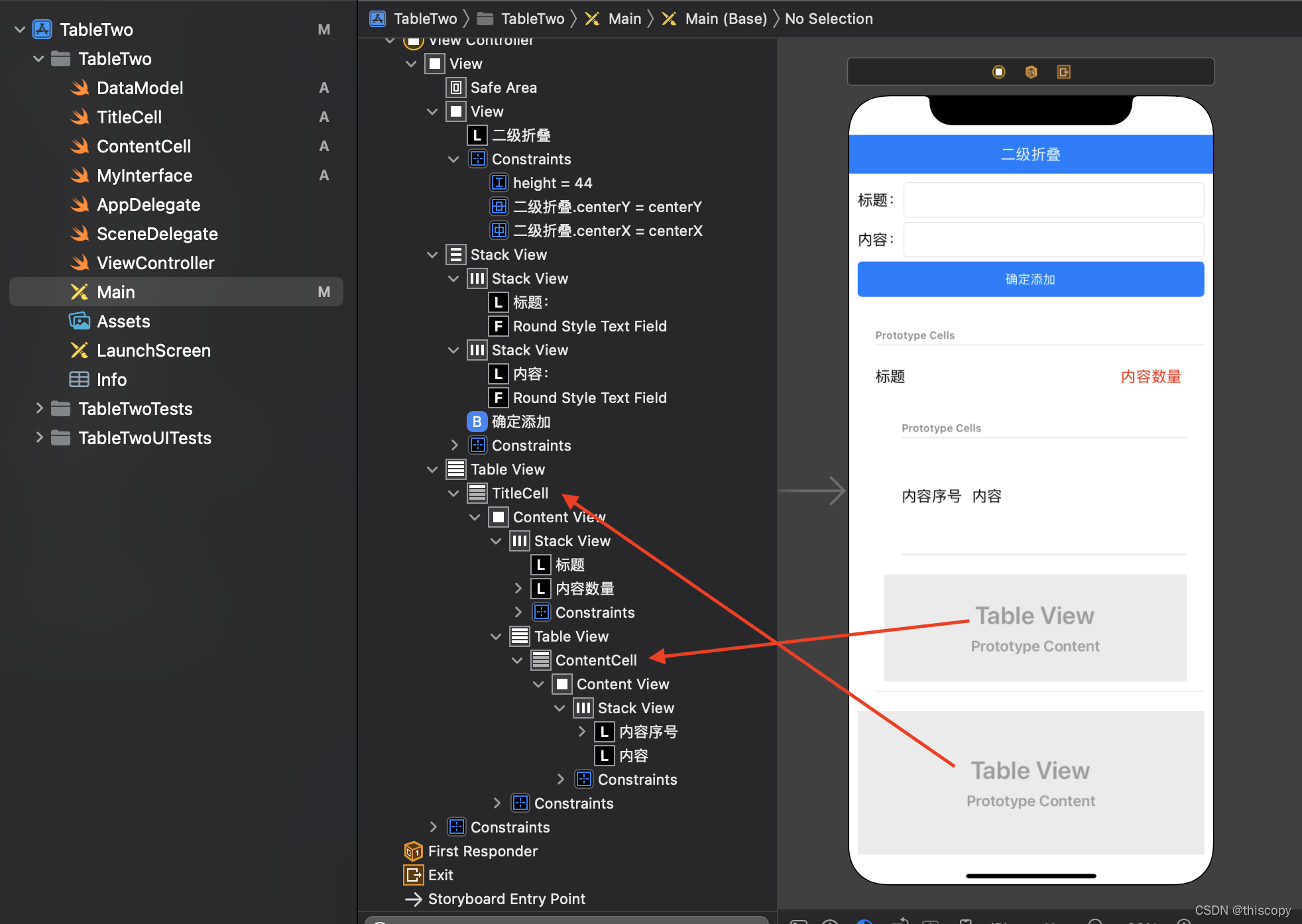 ? ? ? ? 1、代码图示、TableView关联:外层-TitleCell、内层-ContentCell
