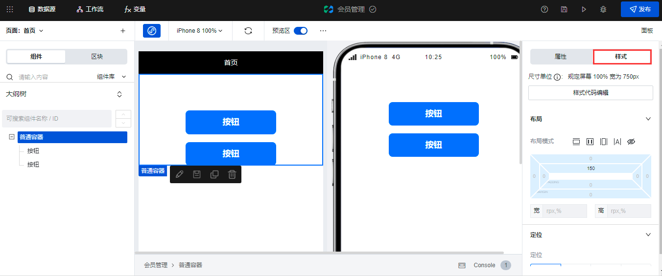 样式定义了之后可以在组件上使用,比如选中普通容器组件,切换到样式标签  找到自定义部分,可以选择不同的类  如果组件上设置了自定义样式类的,在组件的大纲树视图里会出现一个CLS的图标,意思这个组件设置过了样式类  为什么要将样式定义到样式文件里?这个主要是为了代码复用和可维护。如果很多地方都用到了相同的样式,那么我们将公共部分抽象到样式文件里,每个组件只是选择一下就可以。另外一个好处是如果我们在样式文件里修改了样式,那所有应用到这个样式的组件就都发生了改变,也就省得下每个组件都重复进行修改。