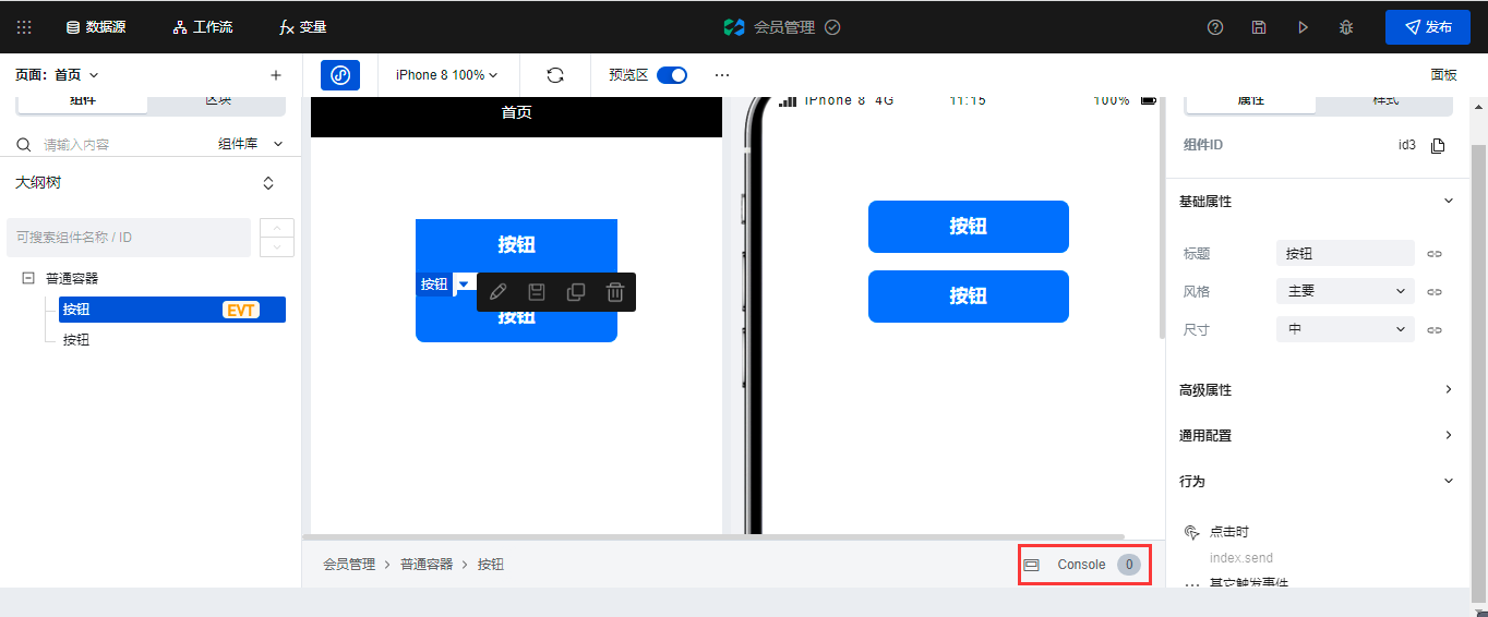 如何让自定义方法生效呢,我们可以选中按钮组件,在属性页签的下边点击添加行为  在弹出的窗口里选择自定义方法,选择我们刚才设置的自定义方法  然后在编辑器点击console窗口  点击一下按钮可以看到刚出输出的两个变量都打印到了控制台中  不同的组件这里边的内容不同,尤其在我们编程时候需要获取组件里的值的,这两个对象都比较有用。
