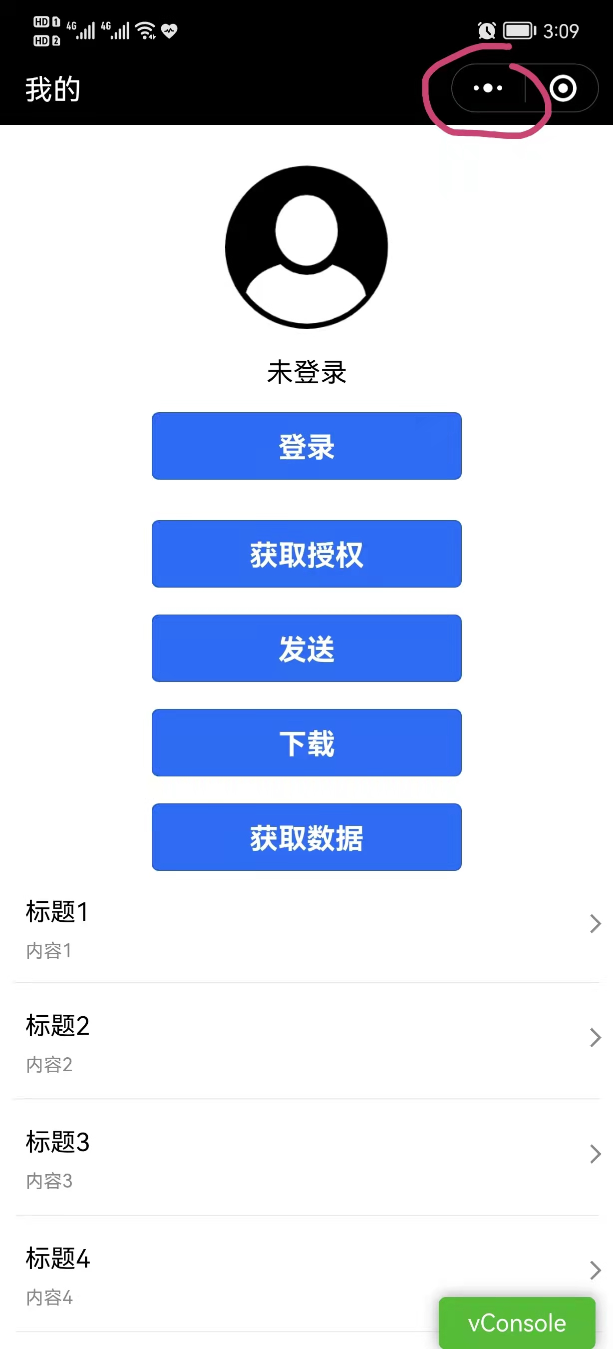 如何查看具体的效果呢?点击导航条的发布按钮,选择发布成体验版的小程序即可  小程序里如何调试呢?首先打开你的小程序,在右上角点击三个点的图标  在弹出的窗口选择开发调试菜单  点击了之后小程序右下角就会出现一个vConsole的图标  点击这个图标就可以看到调试窗口了,一般我们代码中使用console.log打印的信息会出现在这里。熟练的使用console.log打印变量的信息也是做开发的基本功,基本上通过信息的打印你就可以解决大多数的问题。
